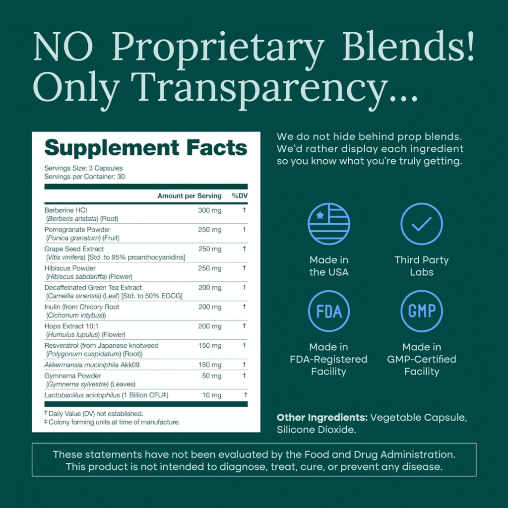 Akkermansia, Berberine, Inulin, Resveratrol, Hops, Polyphenols, Hibiscus, Decaff Green-Tea EGCG, Grape Seed Extract, Prebiotics & Probiotics, Gymnema, Silicon Dioxide, Veggie Capsules